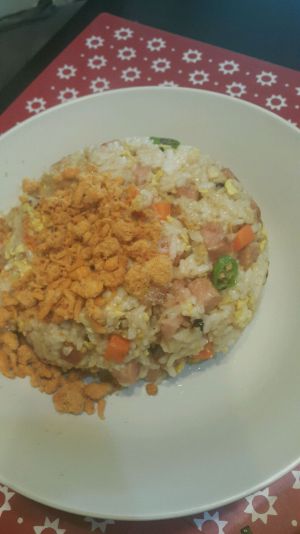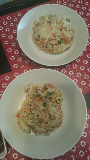 刚才忘记拍照了。 1 热油,用手悬空在油锅上,明显觉得热,有点烤的感觉,下鸡蛋液。 2 把鸡蛋翻炒(其实这个步骤用筷子比较好。)成碎蛋。 3 放切好的菜丁。炒到出香味。 4 加入拌好酱油的米饭。快速翻炒。 5 加盐,细盐。不要以为加酱油就不加盐,酱油适量,加一点盐,这样的味道最好。
