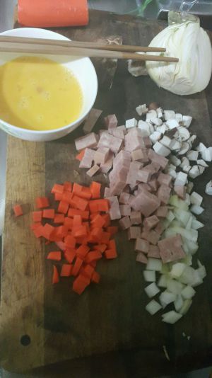 备菜。鸡蛋液,蔬菜切丁。发现了没有,少了绿色。