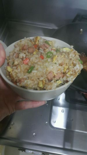 锅里在放油 放入葱煸香 再依次放入胡萝卜 青豆 广味香肠 红椒翻炒 等以上材料炒的差不多熟了 倒入加了酱油的米饭翻炒 最后加入鸡蛋 出锅前加少许鸡精和盐