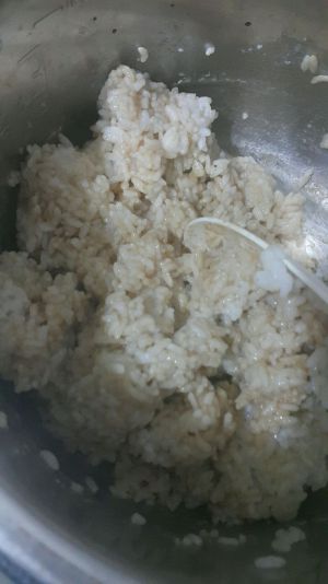 用酱油把剩米饭拌一下,网上有推荐用老抽的,不过我喜欢生抽,两碗米饭4-5勺酱油。