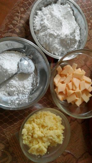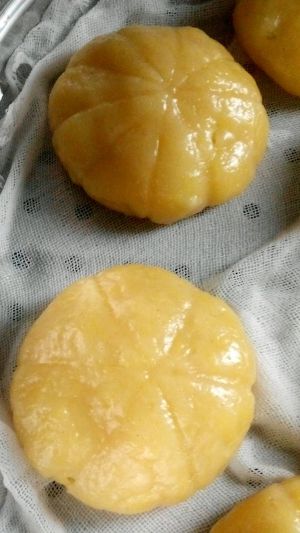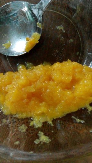 南瓜去皮,去籽蒸熟。加糖压碎。