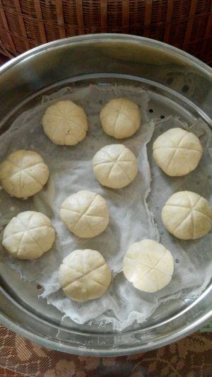 揪出小剂子,搓圆,压扁,包入奶黄馅,再搓圆,调整成扁圆型,用牙签压出南瓜纹路,放蒸笼…蒸笼里纱布要弄湿~