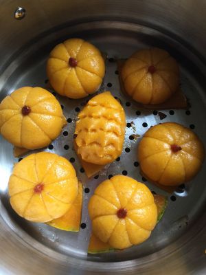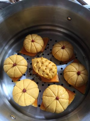 下面垫上生南瓜片,并抹上适量菜油防止粘锅,水开后上锅蒸10-15分钟,根据南瓜饼大小自己掌握火候,乘热出锅,即可食用。