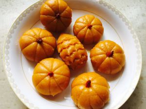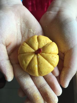 将揉好的面团分成若干小圆球,比乒乓球略大,压成中间厚四周薄的面饼,加入红豆沙馅包成圆球,类似大汤圆,接下来用叉子的侧面压出对称的线条,形成南瓜的纹路,中间加一颗红色枸杞装饰,南瓜饼的雏形就出来了。