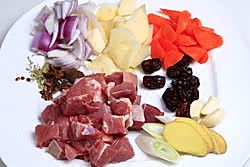 牛腩切大块洗净并控干,土豆、胡萝卜切滚刀块、洋葱切块备用。