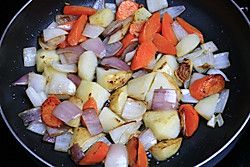 锅中放少许油,烧热放入胡萝卜块、土豆块,洋葱块炒熟(千万不要放入牛肉锅一起炖,会很烂的)。