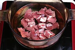 锅中做凉水放入牛肉块,焯水,吐尽血沫,捞出冲净。