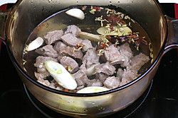 牛肉切条飞水后捞出切块,高压锅另起水放入大料八角,锅开后20分钟捞出待用