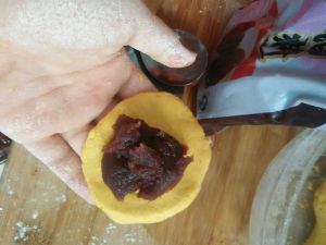 将面矶用手捏成片,包入豆沙陷或白糖,捏紧口,摁扁。我还做了咸味的,就是在面团里加了点盐,没有馅,摁成了面饼