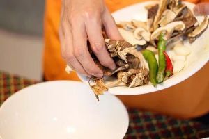 用油、葱煸香后,放入牛肝菌、老人头、鸡纵菌快炒至熟(必须炒熟、如果锅太干可加入热水继续炒,大约炒5分钟);
