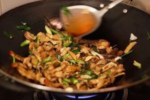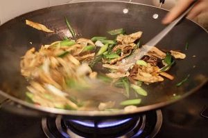 炒熟的菌菇后,继续放入花肉、蚝油继续快炒至熟;
