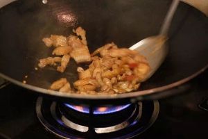 用油、蒜蓉把锅爆香后,放入花肉快炒至金黄色待用;