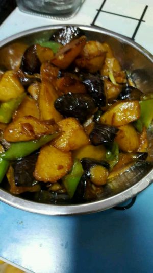 锅里剩一些油,再次开火,把葱姜蒜倒入锅内爆炒,然后再倒入盐,生抽,糖,如果愿意勾芡再勾芡下。随后倒入刚炒至金黄的土豆和茄子,另外倒入青椒,调小火,倒一点水,盖锅盖闷一会。