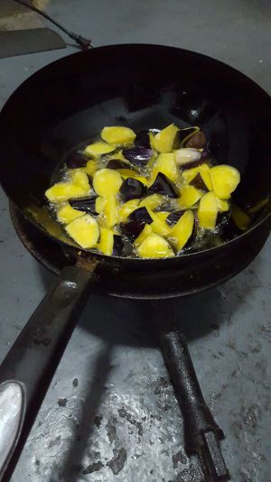 将土豆,裹好淀粉的茄子分别炸至金黄,最好用平底锅。