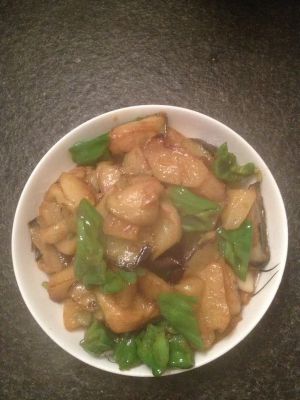 锅内留少许油,放葱姜爆锅,放入土豆和茄子,炒软后放入青椒。调味:盐、糖、少许生抽!