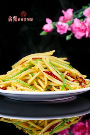 先锅里放进油、放入花椒和辣椒圈爆锅、在放入尖椒丝炒一会,在放入土豆丝和胡萝卜丝爆炒一下、放醋、味极鲜、花椒面、姜粉、味精、盐、大火爆炒、