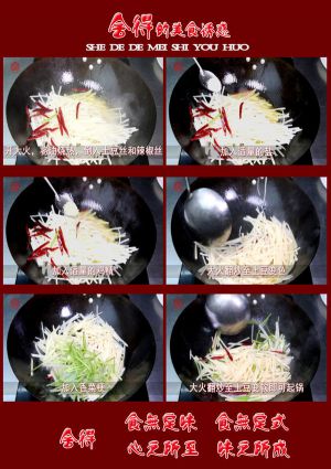 先热锅,放油,放入切好的葱姜蒜末 待煎糊后放入辣椒 土豆丝翻炒,大约三分钟,放各种佐料,用淀粉水勾芡,翻炒半分钟,关火,出锅。