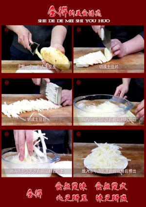 土豆一个,削去土豆皮,再切成土豆片,最后切成土豆丝,放入水中洗去表面的淀粉后捞出;
