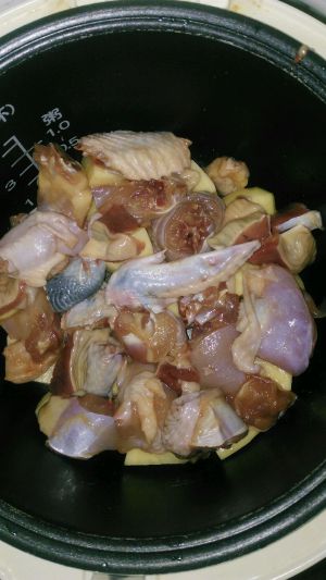 鸡肉腌制半个小时后,倒入已铺好土豆的电饭煲中!然后按煮饭的键,十五分钟左右就行了!(过程中你会闻到很香很盐焗鸡和土豆的味道!蒸汽不停的漂出!五分钟后就可以按保温,或者关掉电源了)不能马上开盖,让他慢慢的蒸干水分,闷两三分钟后就行了!可以开盖~香味扑鼻而来!