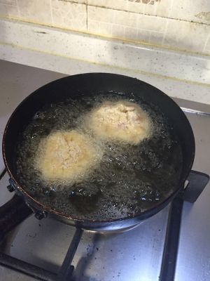 将拌好的混合土豆泥用手抓适量的量,搓圆压扁,过上玉米淀粉后放入蛋液中滚一下,再裹上粗粒面包糠,放入加热后的油锅里(油温180度,没有温度计的小伙伴,就抓几粒面包糠丢入油锅里,能冒泡浮起来就可以将可乐饼下锅炸了)