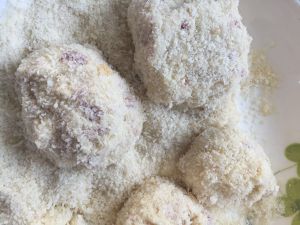 将混合好的土豆泥分成若干份,用手搓成自己想要的形状,圆柱也好,圆球也好,圆饼也好,然后再依次裹上面粉、蛋液、面包糠,这样我们的可乐饼半成品就做好了。