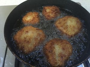 最后多倒一点油,用中火把可乐饼放入锅里炸成金黄色就可以了