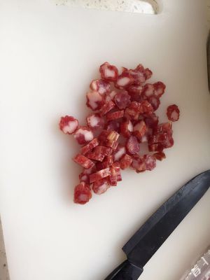 蒸土豆的时候你需要做的是香肠切丁……剁碎...