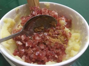 将炒好的培根碎和洋葱碎一起放入土豆泥中,加入适量淡奶油、蛋黄酱、盐和黑胡椒碎,拌匀冷却后备用