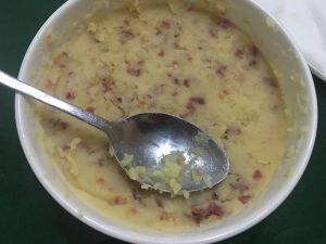 这时候土豆差不多煮软了(时间可以自己掌握,我动作蛮,切完那些东西差不多土豆好了),用勺子压成泥,加一点盐和胡椒粉调味
