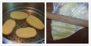 土豆不去皮洗净剖开两半,皮向下放入蒸锅中蒸软。蒸软的土豆去皮后放入保鲜袋中,用擀面杖压成泥(不一定压得很细腻,我喜欢有点颗粒感的)
