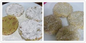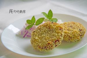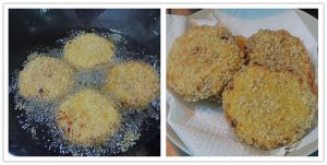 准备好面粉,蛋液,面包糠。把之前混好整体捏成饼状,并依次裹上面粉蛋液面包糠。然后热油下锅,其间多翻翻面,防止糊掉。