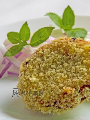 拍上鹰粟粉(玉米淀粉),沾上蛋液,均匀地裹上面包糠