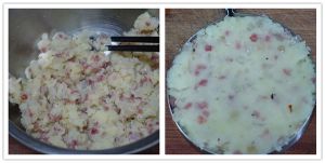 把食材与土豆泥搅拌在一起,撒上盐跟黑胡椒。