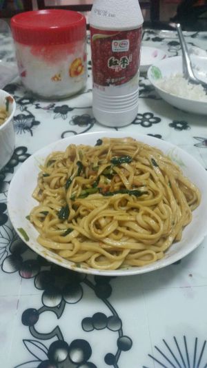 材料翻炒均匀以后,把面条放入炒散后倒入提前调好的炒面酱继续炒均匀。