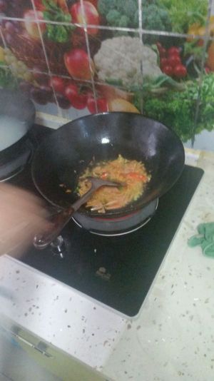 炒出蒜香味后,倒入香肠翻炒均匀,香肠稍微有点焦边卷起来以后倒入洋葱丝、胡萝卜丝和虾仁。