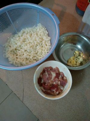 面我之前煮开的,肉肉加了蚝油腌好的。和拍好的大蒜