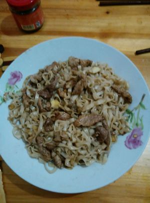 煎一个蛋饼盖上去就好啦。如果不想吃肉丝的,可以直接炒鸡蛋然后放面条来炒。都可以哦。