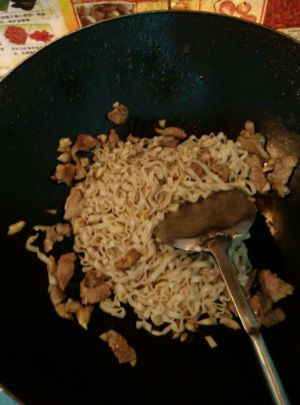 然后放入五香粉,孜然粉,辣椒粉等。不吃辣椒可以不放的。这时候炒面可能开始有点干,放少许水继续翻炒。等到彻底炒均匀就可以出锅了。面条本身是熟的,不用炒那么久,炒透就可以