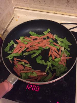 然后先放进去胡萝卜丝,再放入青椒丝。