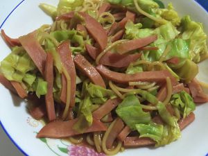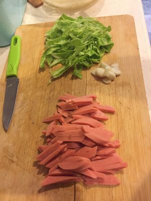 锅中放入油把火腿放入锅中,炒自两面萎黄出锅!