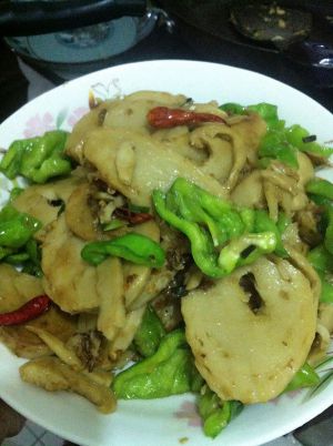 加入面筋后不断翻炒(以防面筋粘锅),这时不需太大的火候(比平时少小一点,我 用的电池炉相对小一个火),待其微黄可在翻炒两下加入酱油和青椒(本人比较喜欢嫩一点,可根据个口味多炒一段时间至其金黄),然后翻炒一至两分钟加入盐、味精翻炒均匀即可