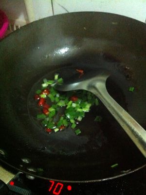 待锅加热放入适量油(比平时烧菜的量稍多一些,面筋比较吃油),然后加入葱、红辣椒,花椒炒香,加入切好的面筋