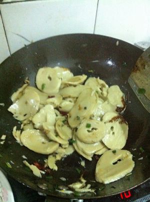 锅中再放少许油,放入韭菜梗和火腿肠炒一会