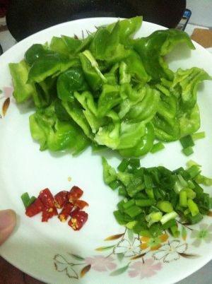 备好材料。干辣椒、香葱切断,青椒切块,面筋切成薄片(根据自己的喜好,可相对切厚,不过我比较喜欢薄一些,好熟好入味)