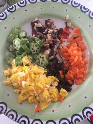 3.五彩杂蔬放油锅里 炒熟 再放入面条 小炒一会放点宝宝酱油 出锅 装盘