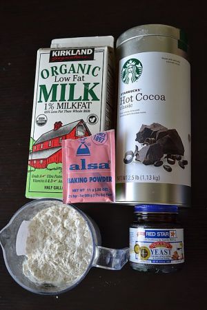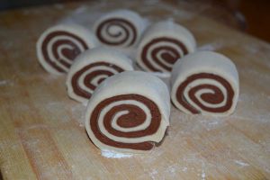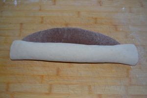 将面粉分成等量两份,一份放白糖,一份添加白糖等量的巧克力粉,加适量牛奶、泡打粉、快速发酵粉,活成等量大小的光滑面团,放在温暖处醒发至两倍大。