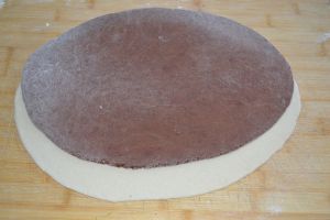 醒发好的的面团在案板上分别擀成同等大小的两张扁皮,不要太薄,5-10毫米厚就行。再次醒发15分钟