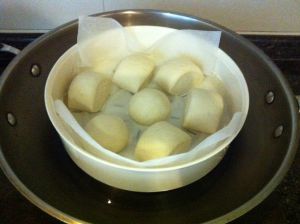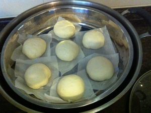 蒸锅放凉水,馒头坯放入蒸锅中盖严盖子,炉上开大火,水开锅后大火8分钟,转中火2分钟,再转最小火2分钟,离火2分钟揭锅。别看这么转来转去的比较麻烦,但是这样蒸出来小馒头十分暄软不起死底,也不会有开锅回缩现象。