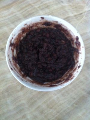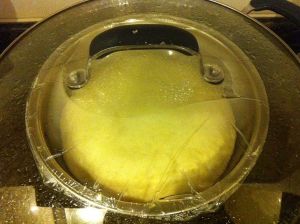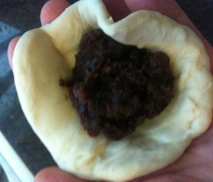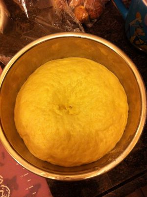用温水加酵母粉,搅拌均匀,和火龙果水一起倒入面粉,和面。完后,隔碗放入温水半小时等面发酵。