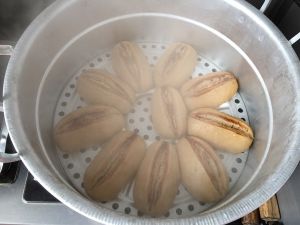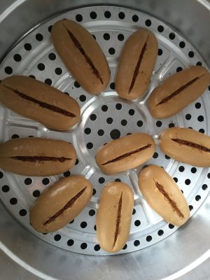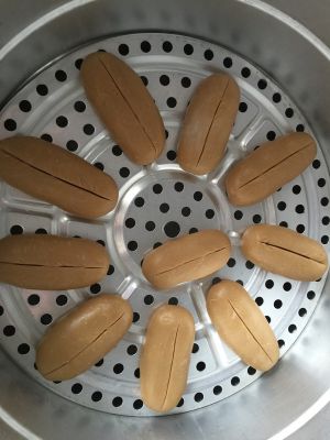 做成长条状,锅中放好水,蓖子抹上油放入做好的面团,用美工刀从中间划一刀,现在这样的天气醒发二十分钟,冬天得30分钟左右,具体得开醒发的成度,如果没有醒发好再增加时间。